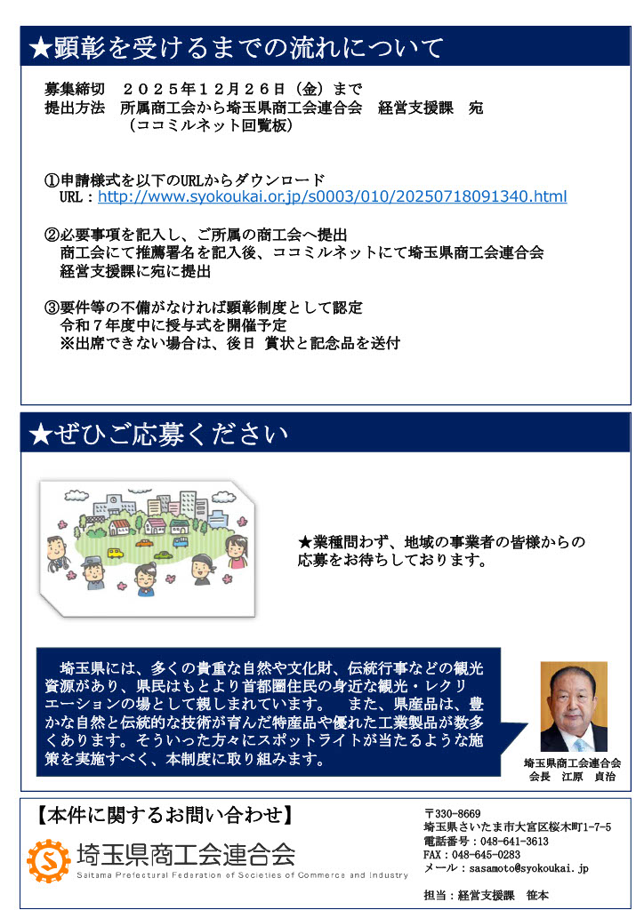 埼玉県商工会連合会では、「地域の宝・地域の宝承継 顕彰制度」を実施することになりました。